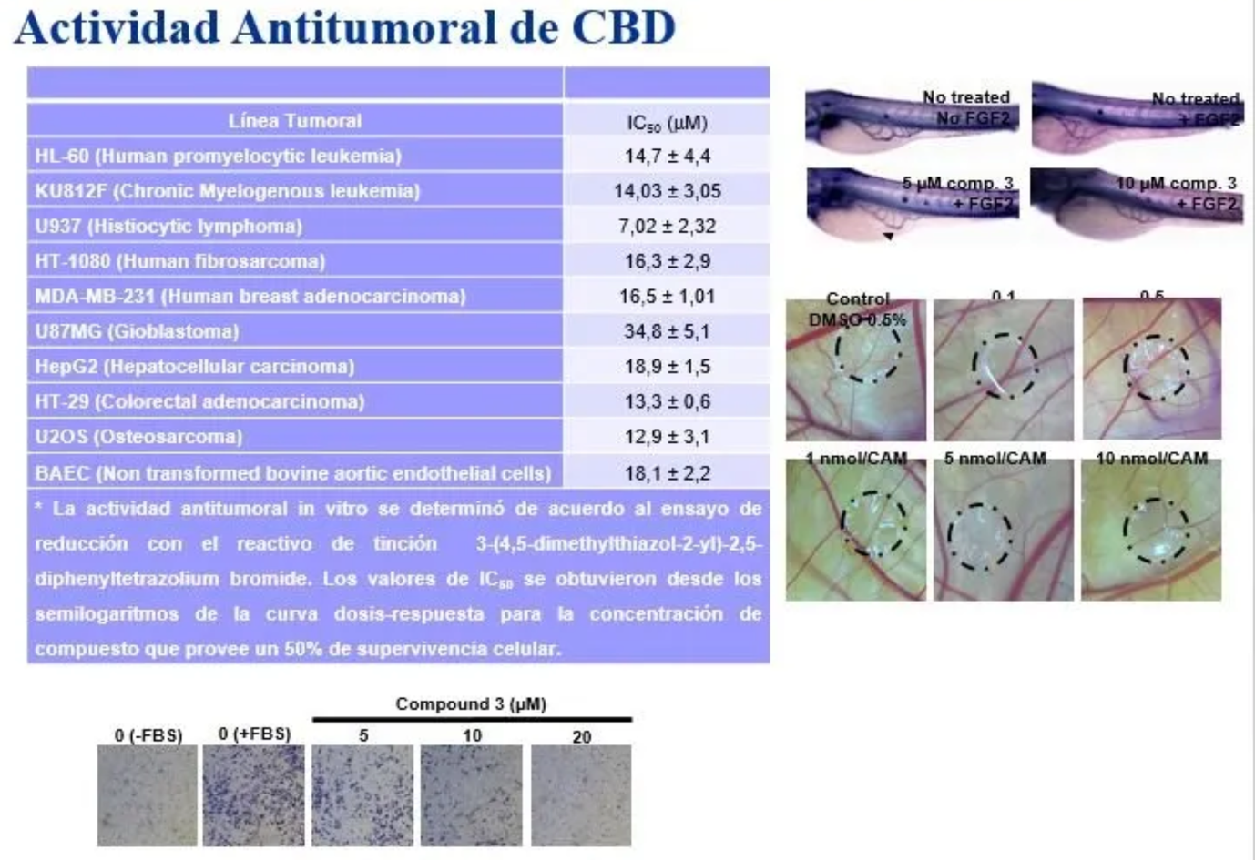 En la UMA se ha llevado a cabo screening biológicos para evaluar la actividad antitumoral de CBD. Se obtuvieron valores significativos de IC50.
